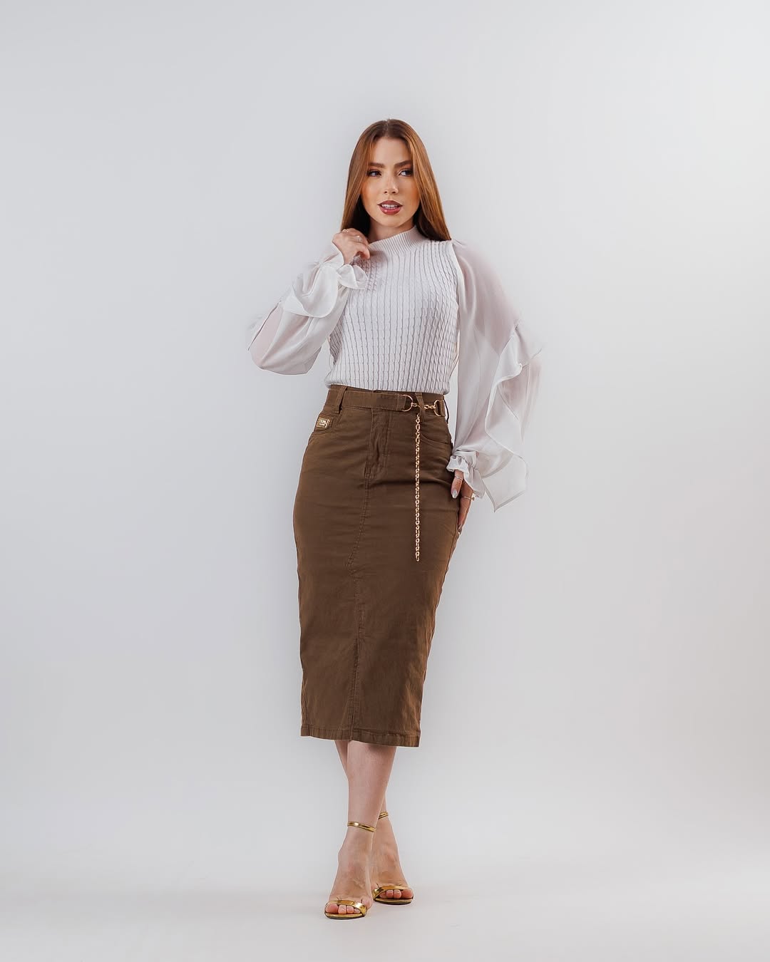 Perfeita para quem busca elegância e sofisticação no dia a dia. Com modelagem lápis que valoriza a silhueta, ela traz um toque moderno através do detalhe em corrente dourada na cintura. O tecido encorpado garante conforto e caimento impecável, tornando-a ideal tanto para looks de trabalho quanto para ocasiões especiais. Combine com blusas leves ou camisas para um visual clássico.